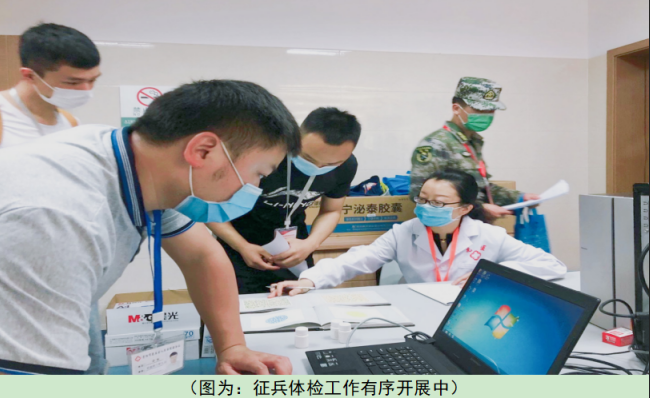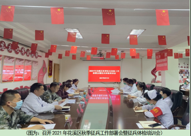统筹部署,加强责任担当。体检是做好征兵工作的重要环节,是保证新兵质量的第一关。坚定持续贯彻落实常态化新冠肺炎疫情防控下的征兵体检工作要求,花溪区人民医院提前谋划、专项成立征兵体检领导小组,挑选政治素质高、业务能力强的各科室骨干医护人员、中共党员参与征兵体检工作,规范流程、严谨审查,高标准高质量挑选兵源,把好征兵体检入口关,全力以赴推进征兵工作稳健高效开展。