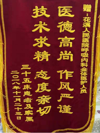 (九)呼吸内科:收到锦旗一面,赠全体医护人员,上书“医德高尚、作风严谨,技术精湛,态度亲切”;