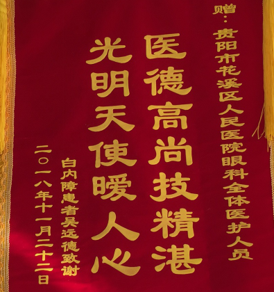(一)眼科:收到锦旗二面,一面赠全体医生护士、上书“重见光明、妙手回春”;另一面赠全体医护人员,上书“医德高尚、及时精湛”;