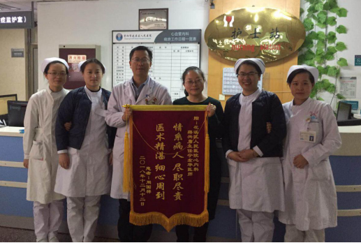 1、心内科:收到锦旗二面,一面赠蒋兴勇主任、宁佐华医生,上书“情系病人、尽职尽责”;另一面赠沈红伟副主任医生、钟政医生,舒莹莹医生、高沙沙护士长及全体医护人员,上书“情系患者、胜似亲人”;