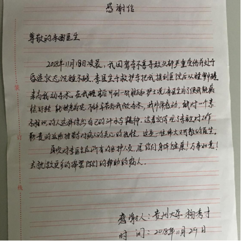 1、外一科:患者送表扬信一封,表扬李雷医生为了让患者转危为安,不辞辛劳,为患者做手术,能对一个素不相识人这样付出自己的汗水与精神,这着实体现了对工作职责的这份执着与对病人的关心。这是一位伟大又可敬的医生,对李医生及所有医护人员表示感谢!
