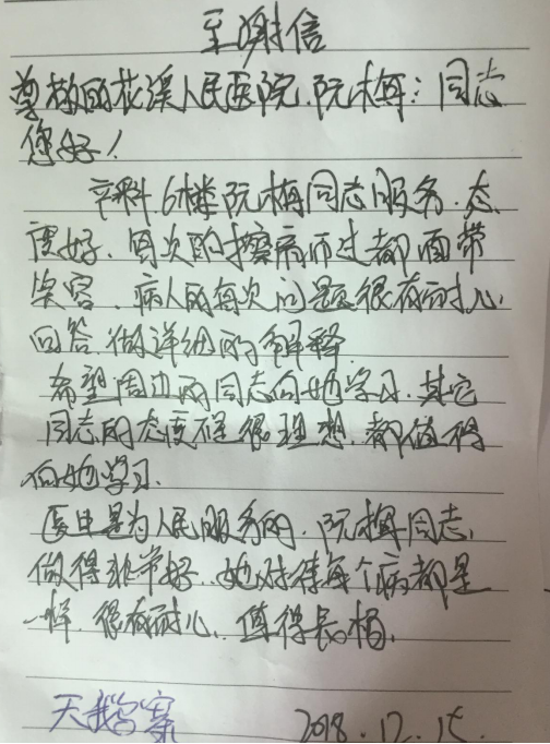 3、产科:12月18日,开启门诊意见箱收到患者送表扬信一封,表扬护士阮梅服务态度好,每次的擦肩而过都面带微笑,病人的每次问题都耐心回答,做详细的解释,希望其他同志向她学习,她对待每个病人都是一样,很有耐心,值得表扬。