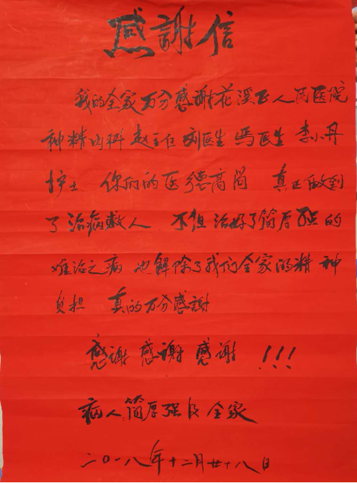 4、神经内科收到感谢信一封,表扬赵医生、刘医生,鄢医生,李小丹护士医德高尚,真正做到了治病救人,不但治好了病人难治之病,也解除了我们全家的精神负担,万分感谢!